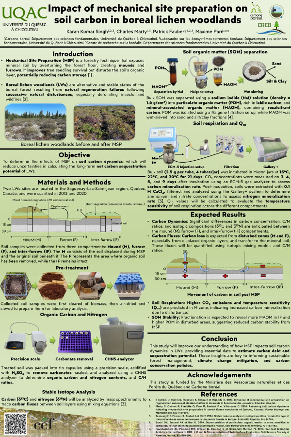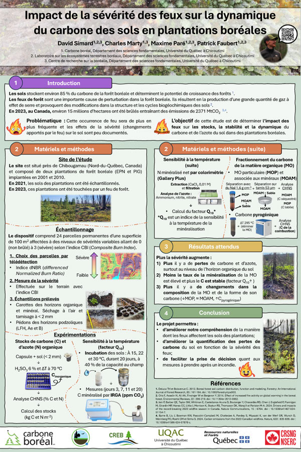 En contexte de changements climatiques, le rôle de la forêt boréale comme puits de carbone revêt une importance cruciale. Toutefois, ces conditions climatiques favorisent l’intensification des événements extrêmes, comme la saison exceptionnelle de feux de forêt de l’été 2023 au Québec (Canada). Dans cette étude, nous utilisons le polygone d’incendie près de Lebel-sur-Quévillon (Québec, Canada) afin de quantifier les impacts des feux de forêt sur le carbone organique du sol (COS). Nous cherchons également à évaluer comment la variabilité spatiale liée à la sévérité des feux, au sein d’une même région incendiée, influence la dynamique du COS. Un total de 40 placettes, allant de non brûlées à sévèrement brûlées ont été établies pour la collecte de couches de matière organique et minérale. Une reconstruction du stock de COS montre qu’environ 30 à 65 Mg de COS/ha peuvent être perdu après le passage d’un feu de sévérité élevé. Les sites intacts, eux, se trouvaient principalement sur des sols mal drainés et soulignent qu’un mauvais drainage peut empêcher une combustion sévère et expliquer la variabilité spatiale des feux. Ces résultats permettront d’améliorer les estimations du bilan carbone et les pratiques d’aménagement forestier dans un contexte d’activité croissante des feux de forêt.