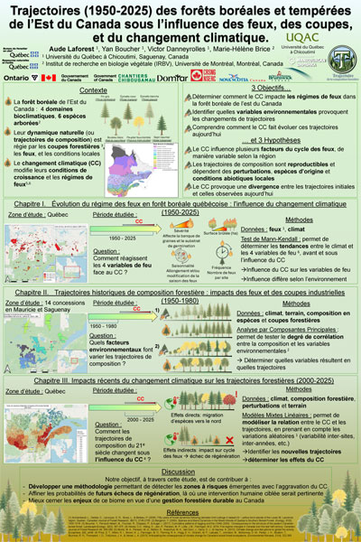 Les changements climatiques favorisent la migration nordique des espèces tempérées vers la forêt boréale, l'érable rouge (Acer rubrum) étant particulièrement apte à progresser au Québec. À sa limite septentrionale dans la sapinière à bouleau à papier, il forme des populations marginales petites, dispersées et isolées, dont la dynamique est modulée par les perturbations naturelles (feux, épidémies de tordeuse) et anthropiques (coupes). Comprendre leur rôle sur l'établissement et la croissance de ces peuplements est crucial pour évaluer le potentiel d'expansion de l'espèce face au réchauffement. Cette étude analyse l'impact des perturbations historiques sur l'érable rouge et ses associés; bouleau à papier (Betula papyrifera) et sapin baumier (Abies balsamea) ; le long d'un gradient de 550 km (Abitibi-Mauricie). Huit populations marginales ont fourni des données dendrochronologiques, croisées avec des cartes écoforestières pour reconstituer feux, coupes et épidémies, et quantifier leur effet sur l'établissement et la croissance radiale à haute résolution spatio-temporelle. Les résultats montrent que les populations marginales d'érable rouge se sont établies principalement au cours de deux vagues, entre 1860-1890 puis 1900-1920, sans correspondance directe avec les perturbations majeures identifiées. L'établissement apparaît plutôt comme un processus continu, ponctué d'épisodes d'intensification typiques d'une essence pionnière, se produisant en dehors des grandes phases de perturbation. Les analyses de croissance indiquent en outre que l'érable rouge maintient une croissance soutenue malgré sa proximité de la limite nord de son aire. Ces observations nuancent le rôle des perturbations majeures comme moteur principal de la dynamique et de l'expansion nordique de l'espèce, et suggèrent que l'érable rouge agit comme une essence opportuniste exploitant surtout les microperturbations locales, telles que les chablis et les trouées de canopée, ce qui renforce son potentiel compétitif en zone marginale.
