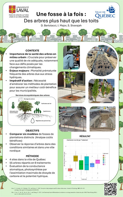La ville de Québec est reconnue pour la grande diversité de ses forêts urbaines. Directement au contact avec la population à laquelle elles apportent de nombreux services, ces forêts sont au centre de multiples enjeux de gestion et de préservation. Cette visite de terrain va vous présenter les pratiques et les recherches scientifiques qui y sont menéees. Plus précisément, la visite va proposer différents arrêts à travers les boisés de l'Université pour montrer quelques projets réalisés et aborder les thèmes suivants : (1) La gestion des arbres de rue dans la ville de Québec, incluant la création de fosses, les plantations et l'entretien des arbres d?alignement (Jérôme Picard, Ville de Québec). On abordera aussi les recherches sur les effets des types de fosses de plantation sur les arbres (Claudelle Bourque, Chaire de recherche sur l'arbre urbain et son milieu (Janani Sivarajah)). (2) La gestion des milieux naturels, à travers la restauration et la conservation des boisés urbains (Dominic Augé, Ville de Québec). Ce sera un des aspects importants de la prochaine "vision de l'arbre" établie par la ville de Québec. (3) Les recherches actuellement menées dans deux projets sur de nouvelles pratiques de séquestration de carbone dans les sols. Le premier projet vise à construire des sols fertiles riches en carbone à partir de déchets urbains. Le deuxième projet vise à réduire les émissions de gaz à effet de serre en utilisant du biochar comme amendement du sol dans les fosses des arbres (Claudelle Bourque). (4) Les maladies qui impactent la santé des arbres urbains et font l'objet de recherches pour comprendre les mécanismes et développer des stratégies de résistance (Pauline Hessenauer, Institut de biologie intégrative et des systèmes). (5) Enfin, les enjeux sociaux entourant les forêts urbaines seront discutés (Manuella Strukelj, Centre d'étude de la forêt).