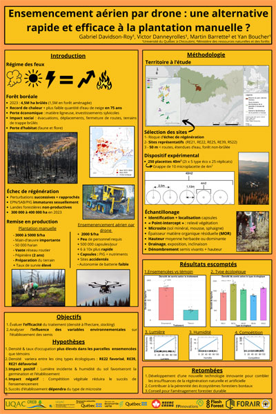 Les changements climatiques ont entraîné une augmentation de l'activité des feux de forêt dans la zone boréale. En 2023, le Québec a connu une saison de feux record, avec 4,5 millions d'hectares brûlés, entraînant des échecs de régénération à grande échelle. Bien que la plantation manuelle demeure la principale méthode de reboisement, celle-ci est coûteuse et fortement dépendante de la disponibilité en main-d??uvre. Ainsi, l'ensemencement aérien par drone représente une alternative prometteuse à faible coût. Toutefois, peu d'études ont caractérisé son efficacité. L'objectif de cette étude est donc d'évaluer l'efficacité de l'ensemencement aérien par drone de pin gris dans un paysage forestier affecté par des perturbations successives en forêt boréale québécoise. Nous avons établi 55 placettes dans un secteur de la Réserve faunique Assinica ayant subi deux feux successifs (2005 et 2023) afin d'évaluer la dispersion des capsules de semences et les taux de germination à la fin de la première saison de croissance. Ces placettes ont été réparties selon cinq types écologiques (RE12, RE21, RE22, RE25, RS22) représentant des gradients de conditions édaphiques et de compétition arbustive. Selon le type écologique, la distribution des capsules variait entre 15 905 ± 5 225 (moyenne ± écart-type) et 25 000 ± 12 075 capsules par hectare. Le taux de germination était faible, variant de 1% ± 1,07 dans les sites mal drainés dominés par la sphaigne à 2,5% ± 2,36 dans les sites bien drainés présentant une mince couche organique. La densité de capsules et les taux de germination observés étaient insuffisants pour atteindre les seuils de régénération conformes aux normes forestières. Ces résultats contribueront à orienter les stratégies de reboisement dans les forêts boréales affectées par des échecs de régénération.