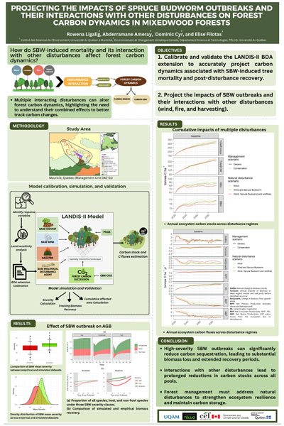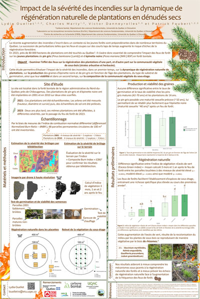 La succession rapide des perturbations forestières accroît le risque d'échec de la régénération naturelle, rendant ainsi la plantation d'arbres une solution inévitable pour assurer le maintien des écosystèmes forestiers. Toutefois, les feux de 2023, ont touchés près de 80000 hectares de plantations au Québec, soulignant l'importance de comprendre l'impact des feux de forêt sur la régénération des plantations en forêt boréale. Notre projet vise donc à analyser deux aspects essentiels : l'effet de la sévérité des feux sur la régénération naturelle de jeunes plantations de pin gris et d'épinette noire établies en 2001 et en 2010 sur des landes à lichens scarifiées, ainsi que sur la composition de la communauté végétale du sous-étage. Les résultats montrent que les plantations de pin gris, une espèce atteignant rapidement la maturité sexuelle, présentent une régénération après feu d'en moyenne 29048 semis/ha contre 4333 semis/ha d'épinette noire dans les plantations 2001 et 11565 semis/ha contre 9782 dans les plantations de 2010. Le type de substrat occasionné par le scarifiage joue un rôle clé dans la survie des semences des deux espèces. Le sol minéral exposé (sillon) constitue en effet un substrat très efficace regroupant près de 90% du nombre total de semis. L'augmentation de la sévérité favorise également l'établissement des semis de pin gris dans les autres compartiments issus du scarifiage et favorise sa régénération naturelle, particulièrement dans les plantations de 2001. Nos résultats démontrent qu'après seulement 13 ans, la régénération naturelle du pin gris atteint des niveaux très satisfaisants (>8000 semis/ha). L'augmentation de la sévérité entraîne également une modification de la structure des communautés végétales, les niveaux de sévérité faibles à modérée favorisant la richesse spécifique du sous-étage par rapport aux témoins. Ces retombées permettront de renforcer la compréhension des réponses de deux espèces dominantes des forêts boréales aux incendies.